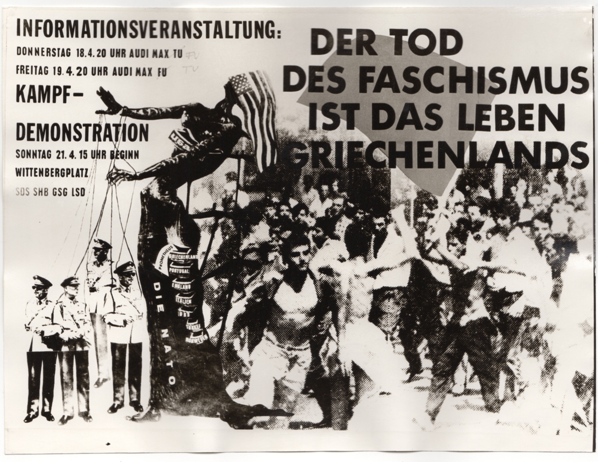 Φωτογραφική, α/μ, φωτογραφικό χαρτί, 18,0×23,7 εκ. Στην πίσω όψη επιγραφή. Αναπαραγωγή αφίσας για την καμπάνια ενημέρωσης και διαδήλωσης σχετικά ενάντια στην δικτατορία στην Ελλάδα που διοργανώθηκε τον Απρίλιο (δεν προσδιορίζεται το έτος) στο Βερολίνο.