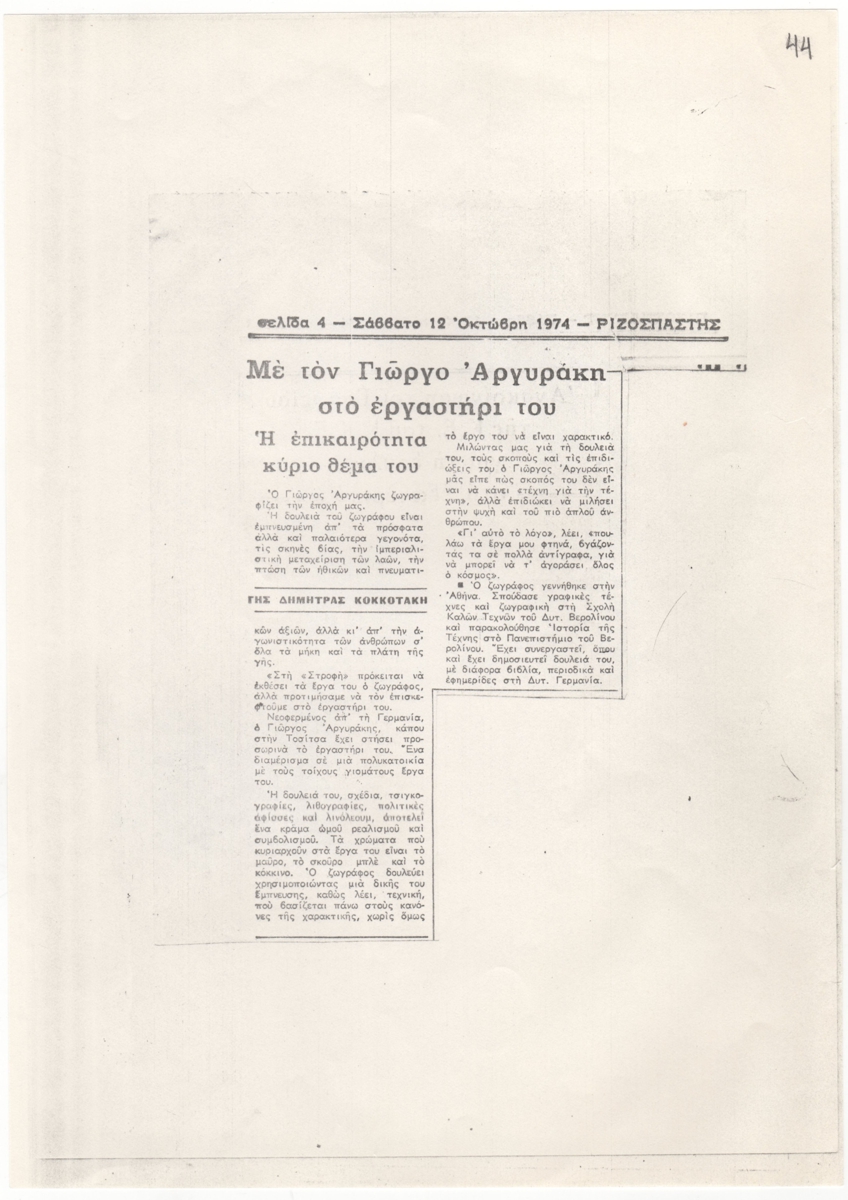 Φωτοαντίγραφο αποκόμματος, έντυπο, χαρτί, 29,8×21,0 εκ., όπου δημοσιεύεται, στα ελληνικά, άρθρο της Δήμητρας Κοκκοτάκη για τον χαράκτη Γιώργο Αργυράκη.