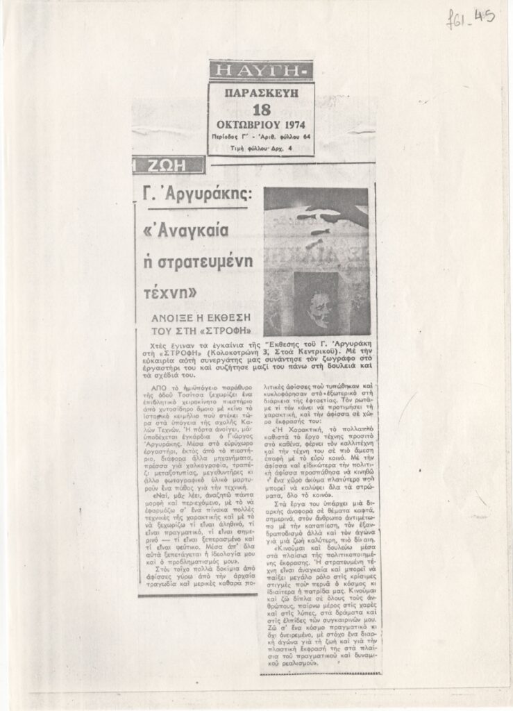 Φωτοαντίγραφο αποκόμματος, έντυπο, χαρτί, 29,8×21,0 εκ., όπου δημοσιεύεται, στα ελληνικά, άρθρο αφορά για την ατομική έκθεση έργων του Γιώργου Αργυράκη στην Αθήνα το 1974.