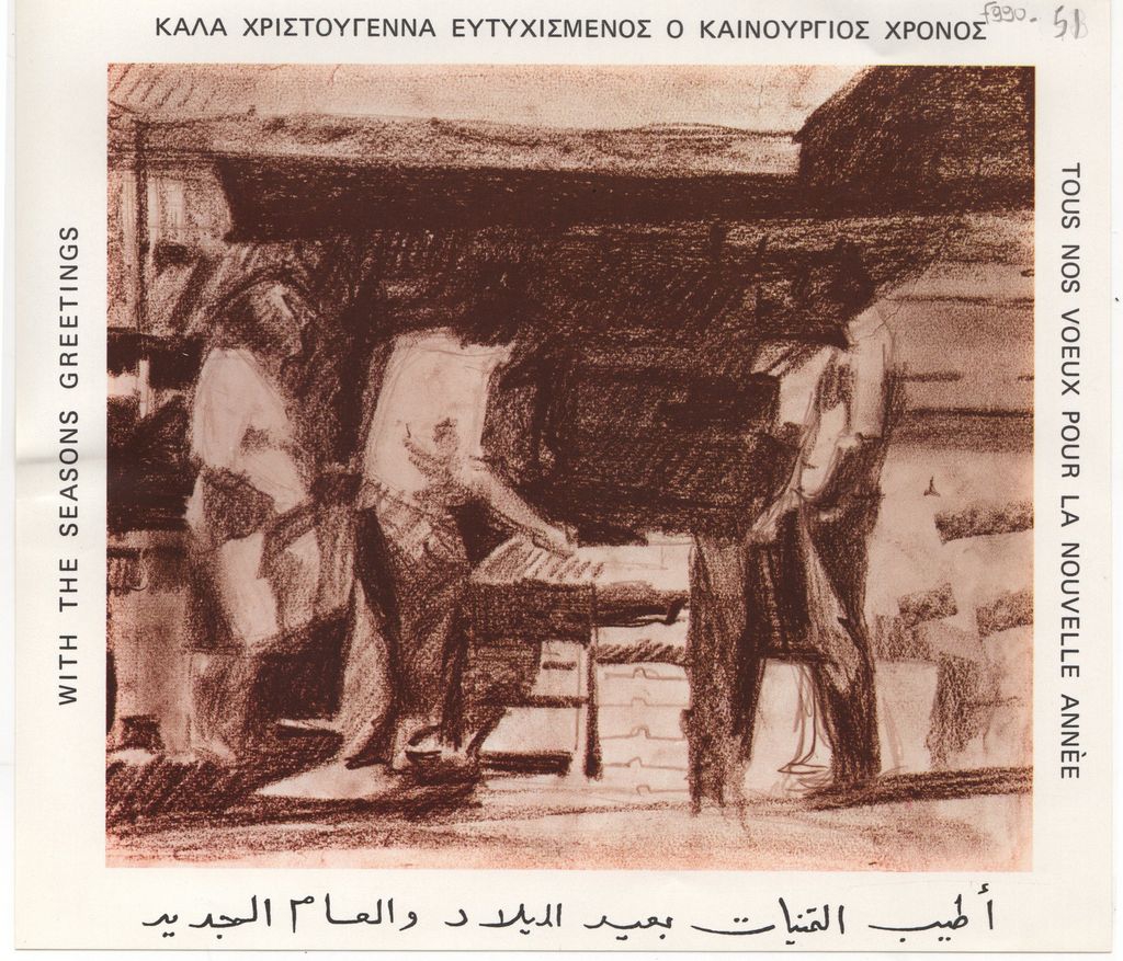 Απόκομμα, έντυπο, στα ελληνικά, αγγλικά, γαλλικά, χαρτί ιλουστρασιόν, 14,0×16,2 εκ. Αναπαραγωγή, σέπια, έργου του Παναγιώτη Τέτση. Στην πίσω όψη, επιγραφή με το όνομα του καλλιτέχνη.