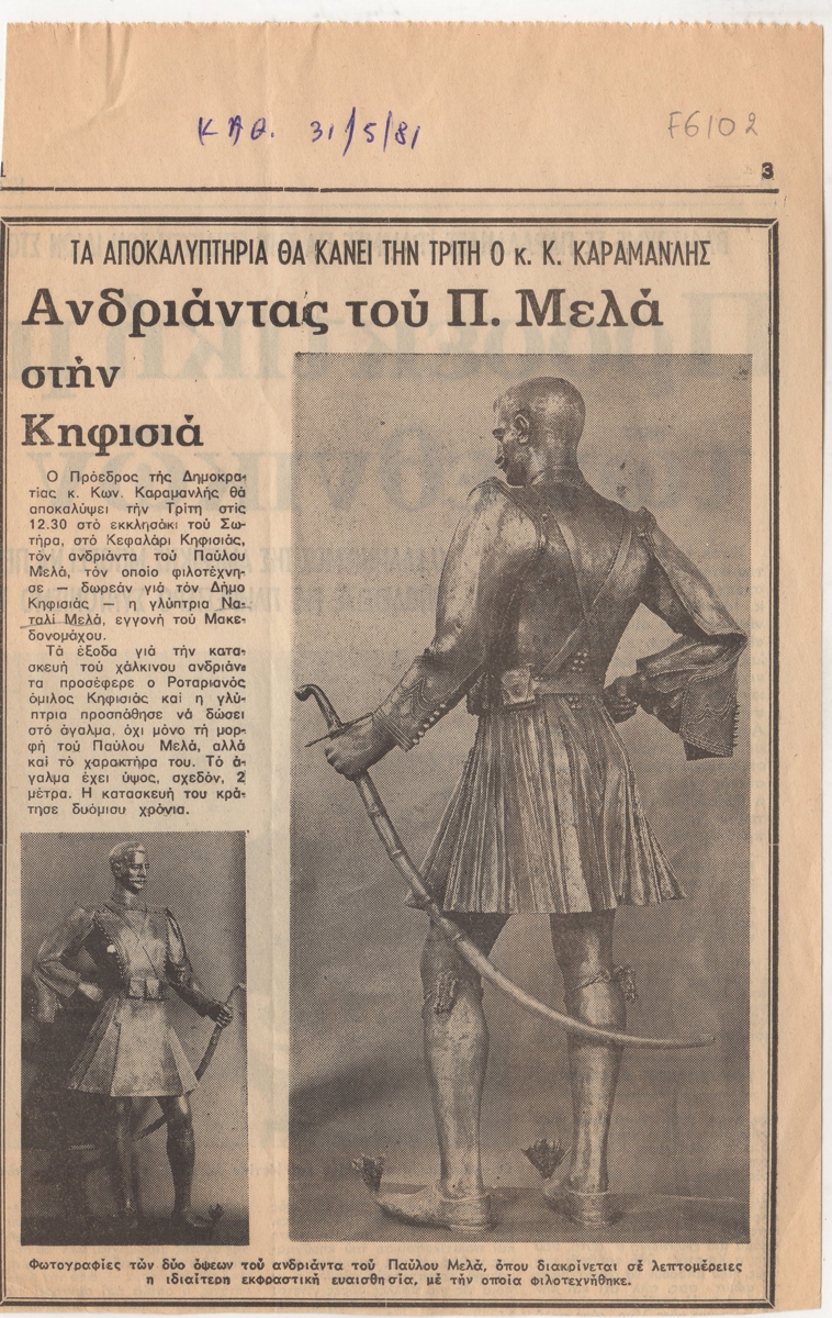 Απόκομμα, χαρτί, 25×16 εκ., στα ελληνικά, δημοσίευσης άρθρου αναφερόμενου στα αποκαλυπτήρια ανδριάντα του Παύλου Μελά, από τον Κωνσταντίνο Καραμανλή στην Αθήνα. Το έργο φιλοτέχνησε η εγγονή του Μακεδονομάχου Ναταλία Μελά. Το απόκομμα εικονογραφείται και φέρει επιγραφές.