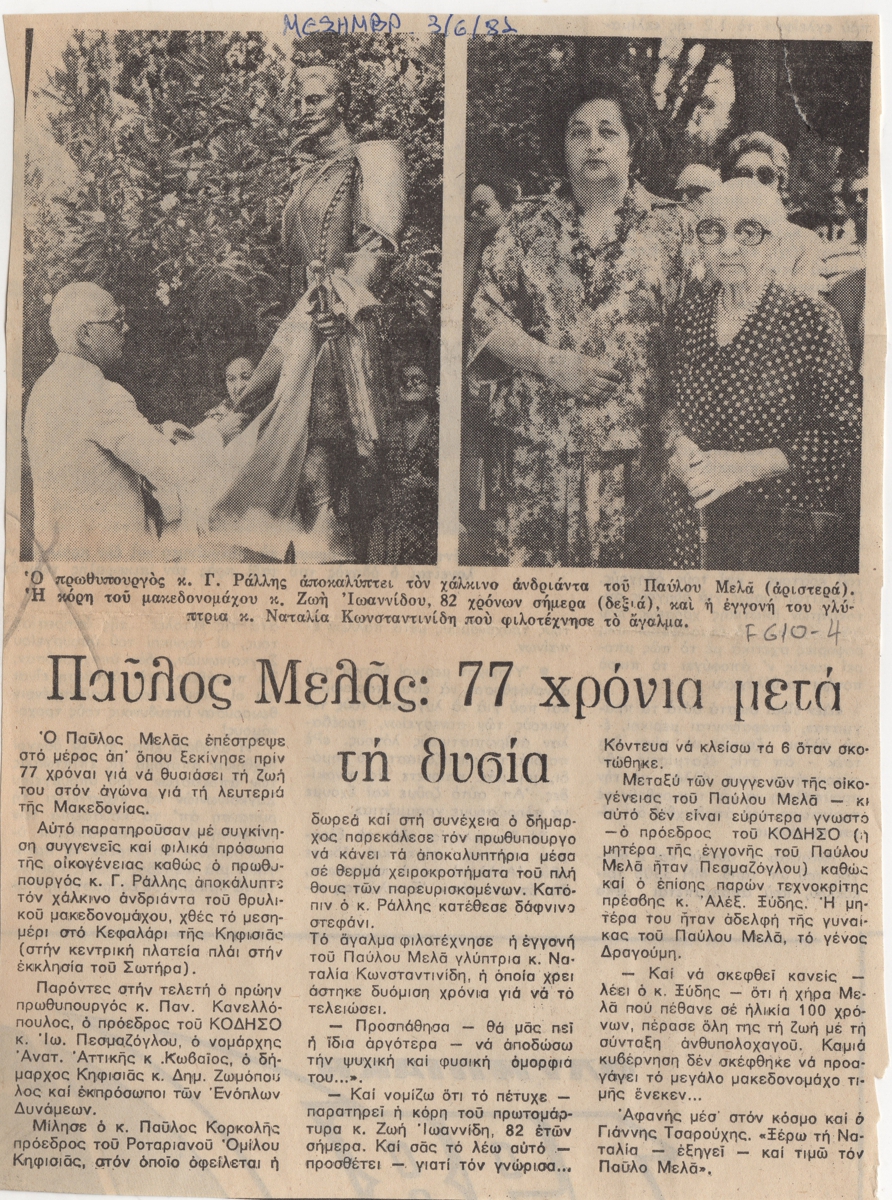 Απόκομμα, χαρτί, 20,5×15 εκ., στα ελληνικά, δημοσίευσης άρθρου που αναφέρεται στα αποκαλυπτήρια ανδριάντα του Παύλου Μελά, έργο που φιλοτέχνησε η εγγονή του Ναταλία Μελά-Κωνσταντινίδη.