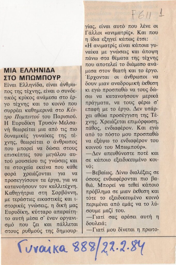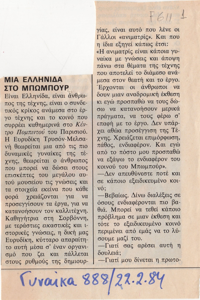 Απόκομμα, χαρτί, 2 φφ ακανόνιστου μεγέθους, στα ελληνικά, δημοσίευσης άρθρου το οποίο αναφέρεται στο έργο της Ευριδίκης Τρυσόν-Μελσανή, η οποία εργάζεται στο Κέντρο Πομπιντού στο Παρίσι, όπου ζει. Το απόκομμα εικονογραφείται και φέρει επιγραφές.