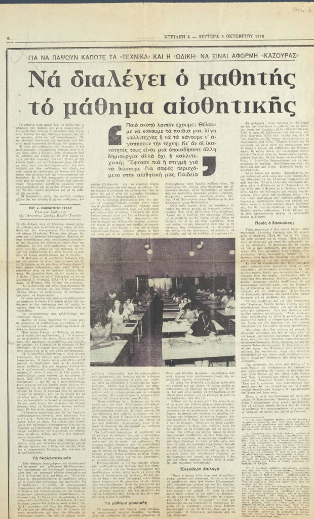 Απόκομμα εφημερίδας (08/10/1978) όπου δημοσιεύεται άρθρο του Παναγιώτη Τέτση σχετικά με το μάθημα της αισθητικής αγωγής στην ελληνική εκπαίδευση.