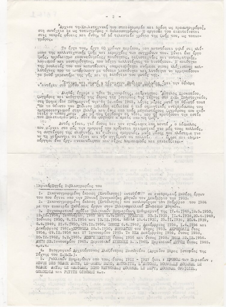 Φωτοαντίγραφο βιογραφικού σημειώματος, δακτυλόγραφο, χαρτί δίπλής όψεως, 29.5×21 εκ., στα ελληνικά, του Στέλιου Μηλιάδη. Περιέχει σπουδές, επαγγελματική και καλλιτεχνική δραστηριότητα, εκθέσεις, εργογραφία και βιβλιογραφία.
