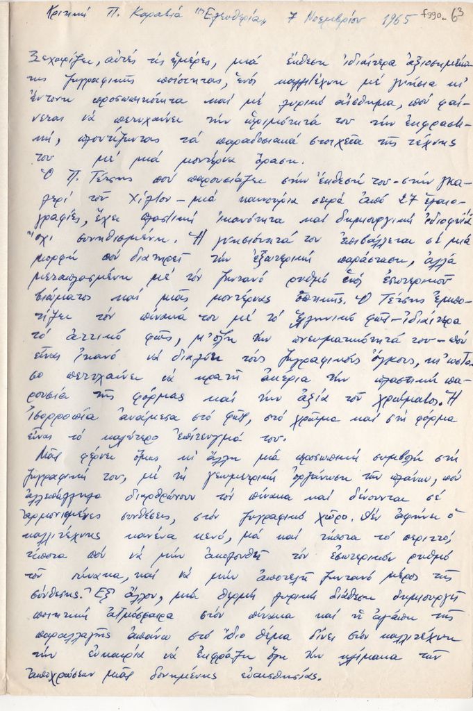 Αποδελτίωση, χειρόγραφη, με μπλε μελάνι, στα ελληνικά, χαρτί, 2 φφ., 29,1×19,6 εκ., κριτικής του Πάνου Καραβία για την ατομική έκθεση του Παναγιώτη Τέτση στην Αθήνα το 1965. Επάνω, επιγραφή.