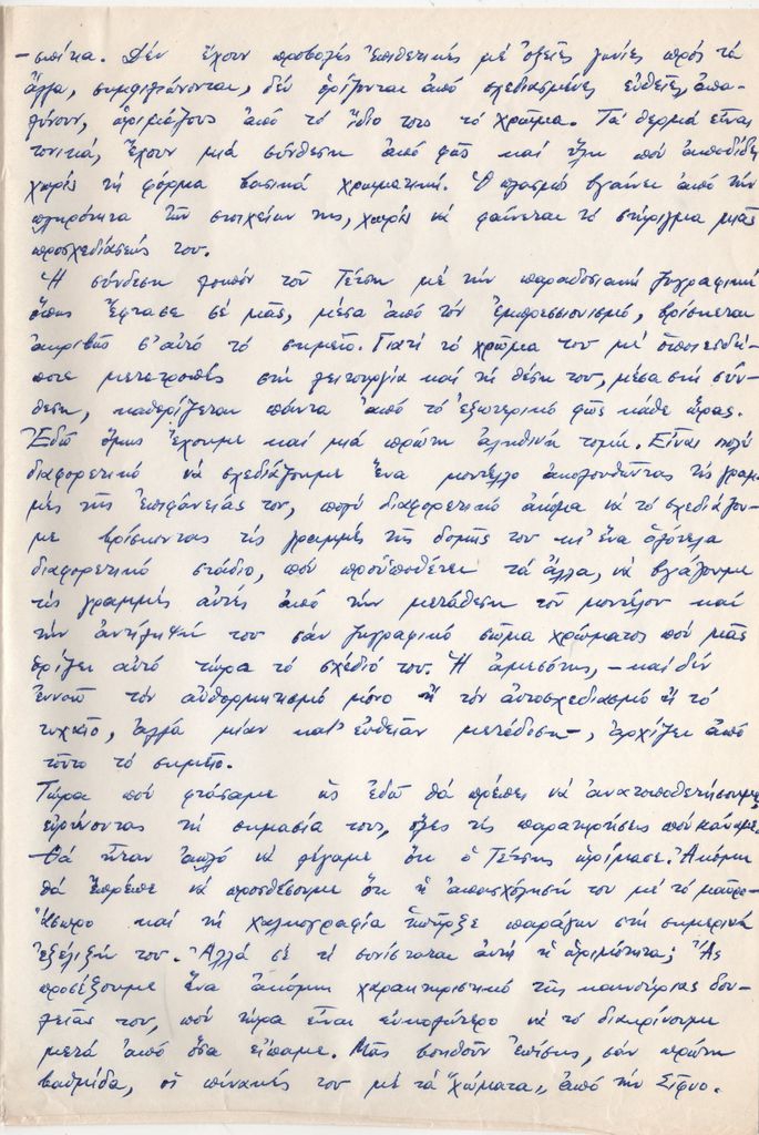 Αποδελτίωση, χειρόγραφη, με μπλε μελάνι, στα ελληνικά, χαρτί, 4 φφ, 28,8×19,6 εκ., της κριτικής της Ελένη Βακαλό για την έκθεση του Παναγιώτη Τέτση στην Αθήνα το 1965. Επάνω, επιγραφή με τα στοιχεία της δημοσίευσης.