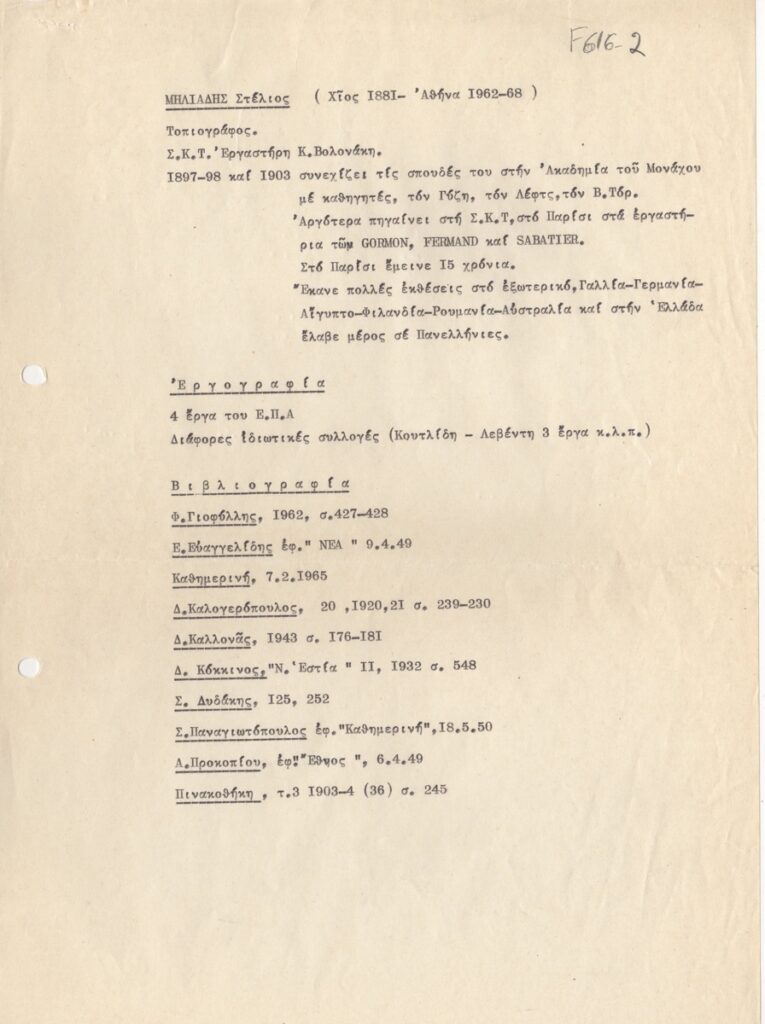 Βιογραφικό, δακτυλόγραφο, χαρτί, 28,5×21 εκ., στα ελληνικά, του Στέλιου Μηλιάδη. Περιέχει σπουδές, εργογραφία και βιβλιογραφία.