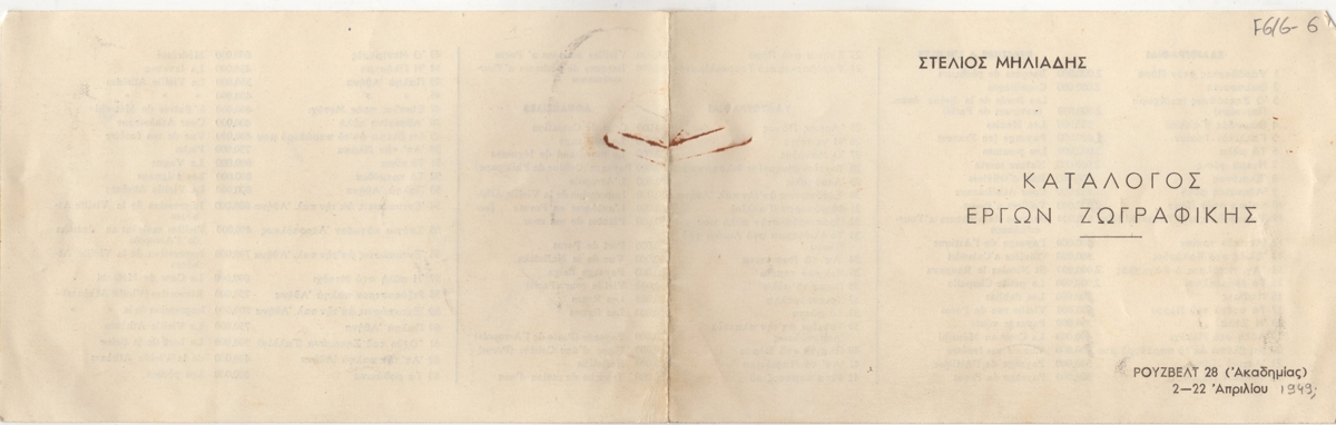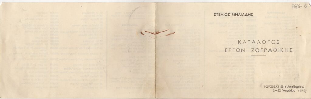 Τιμοκατάλογος, χαρτί αναδιπλωμένο, 11,5×19 εκ., στα ελληνικά και γαλλικά, έργων ατομικής έκθεσης ζωγραφικής του Στέλιου Μηλιάδη.