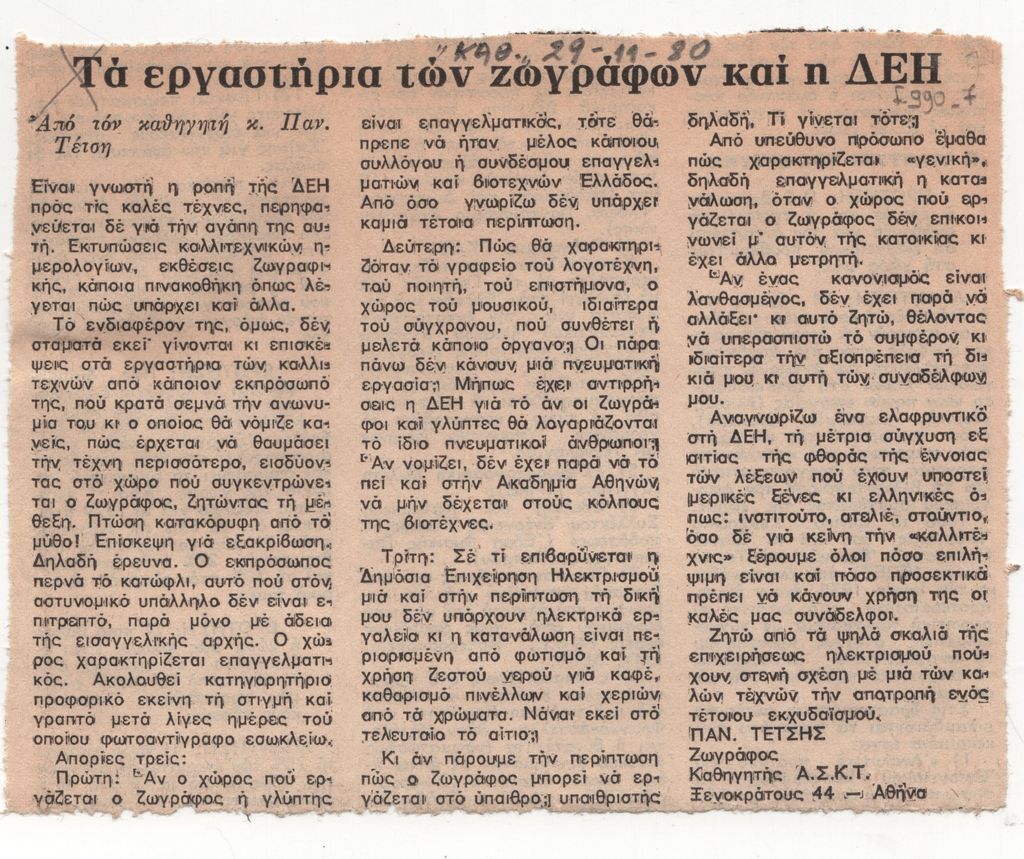 Απόκομμα, έντυπο, χαρτί, 12,015,5 εκ., όπου δημοσιεύεται επιστολή του Παναγιώτη Τέτση σχετικά με τον χαρακτηρισμό των ατελιέ των καλλιτεχνών ως επαγγελματικών χώρων από την ΔΕΗ. Επάνω, επιγραφή με τα στοιχεία της δημοσίευσης.