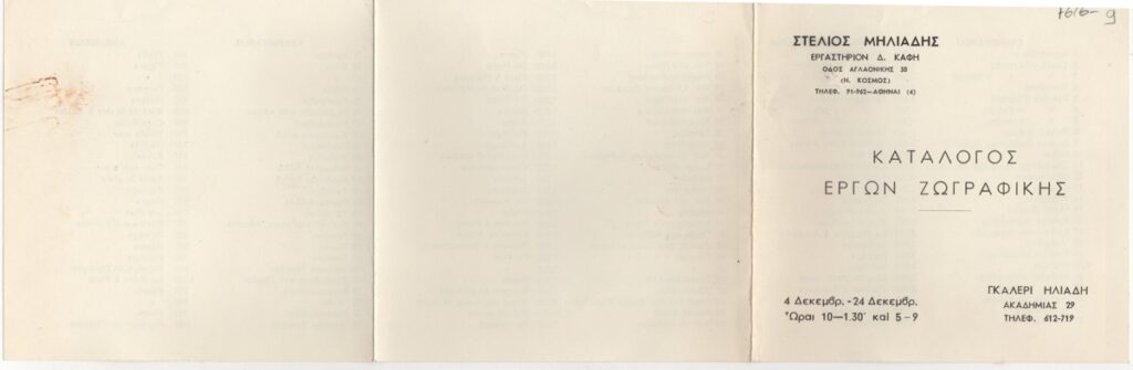 Τιμοκατάλογος, χαρτί δίπτυχο, 12,5×12,5 εκ., στα ελληνικά και γαλλικά, έργων ατομικής έκθεσης ζωγραφικής του Στέλιου Μηλιάδη.