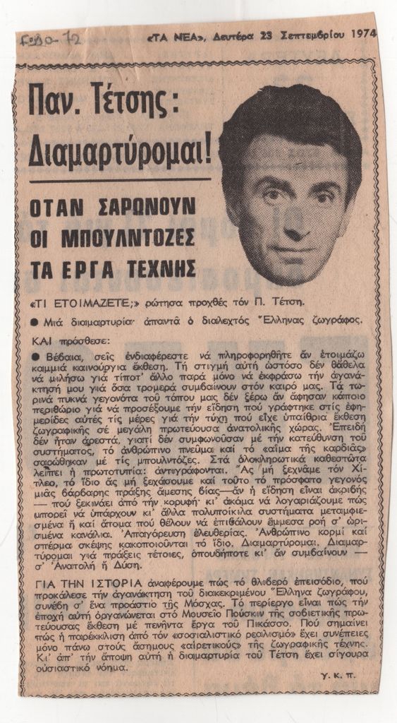 Απόκομμα, έντυπο, χαρτί, 18,0×9,6 εκ., όπου δημοσιεύεται, στα ελληνικά, σύντομη συνέντευξη του ζωγράφου Παναγιώτη Τέτση στον Γ.Κ.Π. με αφορμή την καταστροφή υπαίθριας έκθεσης ζωγραφικής σε προάστιο της Μόσχας.