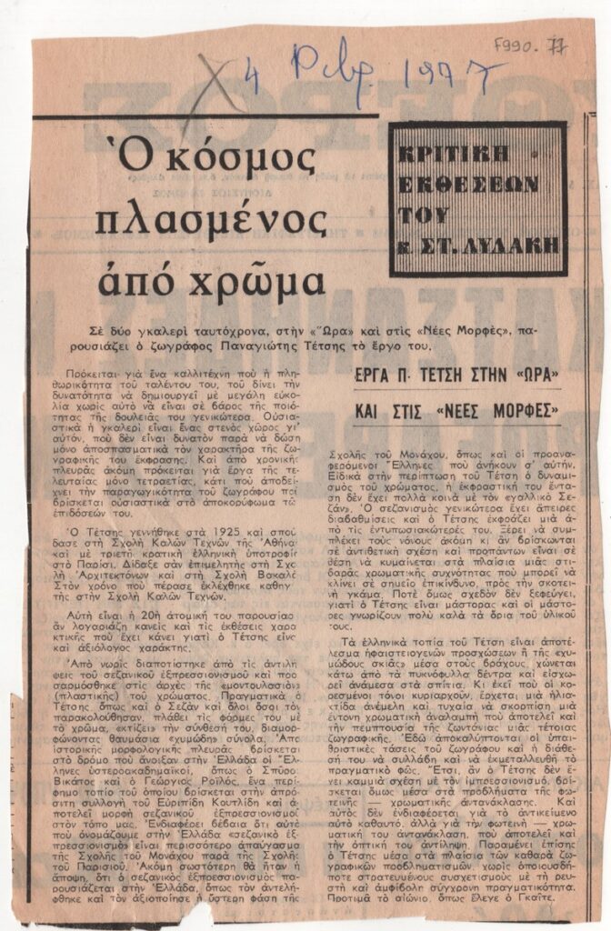 Απόκομμα της εφημερίδας “Ελεύθερος Κόσμος” (04/02/1977), όπου δημοσιεύεται κριτική του Στέλιου Λυδάκη για τις δύο παράλληλες εκθέσεις του Παναγιώτη Τέτση στην Αθήνα.