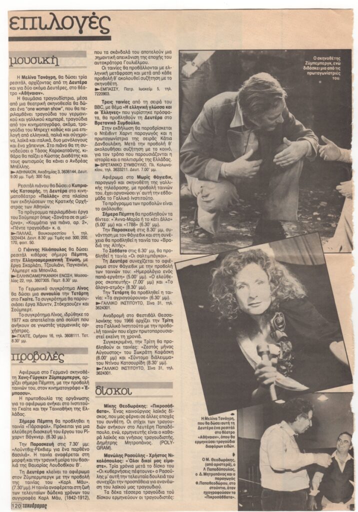 Απόκομμα, έντυπο, χαρτί, 31,0×21,0 εκ., όπου δημοσιεύεται, στα ελληνικά, πολιτιστική ατζέντα με μουσικές εκδηλώσεις, πρόγραμμα προβολών και δισκοπαρουσιάσεις. Αναφέρονται τα ρεσιτάλ της Μελίνας Τανάγρη στο θέατρο “Αθήναιον”, ρεσιτάλ πιάνου του Κυπριανού Κατσαρή στο κινηματοθέατρο “Παλλάς”, ρεσιτάλ κιθάρας του Γιάννη Ηλιόπουλου, στην Ελληνοαμερικανική Ένωση και συναυλία του γερμανικού συγκροτήματος “Λίνος” στο Γκαίτε. Στις προβολές παρουσιάζονται κινηματογραφικά αφιερώματα στον Γερμανό σκηνοθέτη Χανς-Γύργκεν Ζύμπερμπεργκ στον κινηματογράφο “Έμπασυ” και στον Γάλλο σκηνοθέτη Μωρίς Φάγιεβικ, στο Γαλλικό Ινστιτούτο. Τέλος παρουσιάζονται οι δίσκοι : Μίκης Θεοδωράκης “Πικροσάββατα” και Μανώλης Ρασούλης – Χρήστος Νικολόπουλος, “Όλοι δικοί μας είμαστε”. Στην άλλη όψη, ο Μίνως Αργυράκης σχολιάζει την επικαιρότητα.