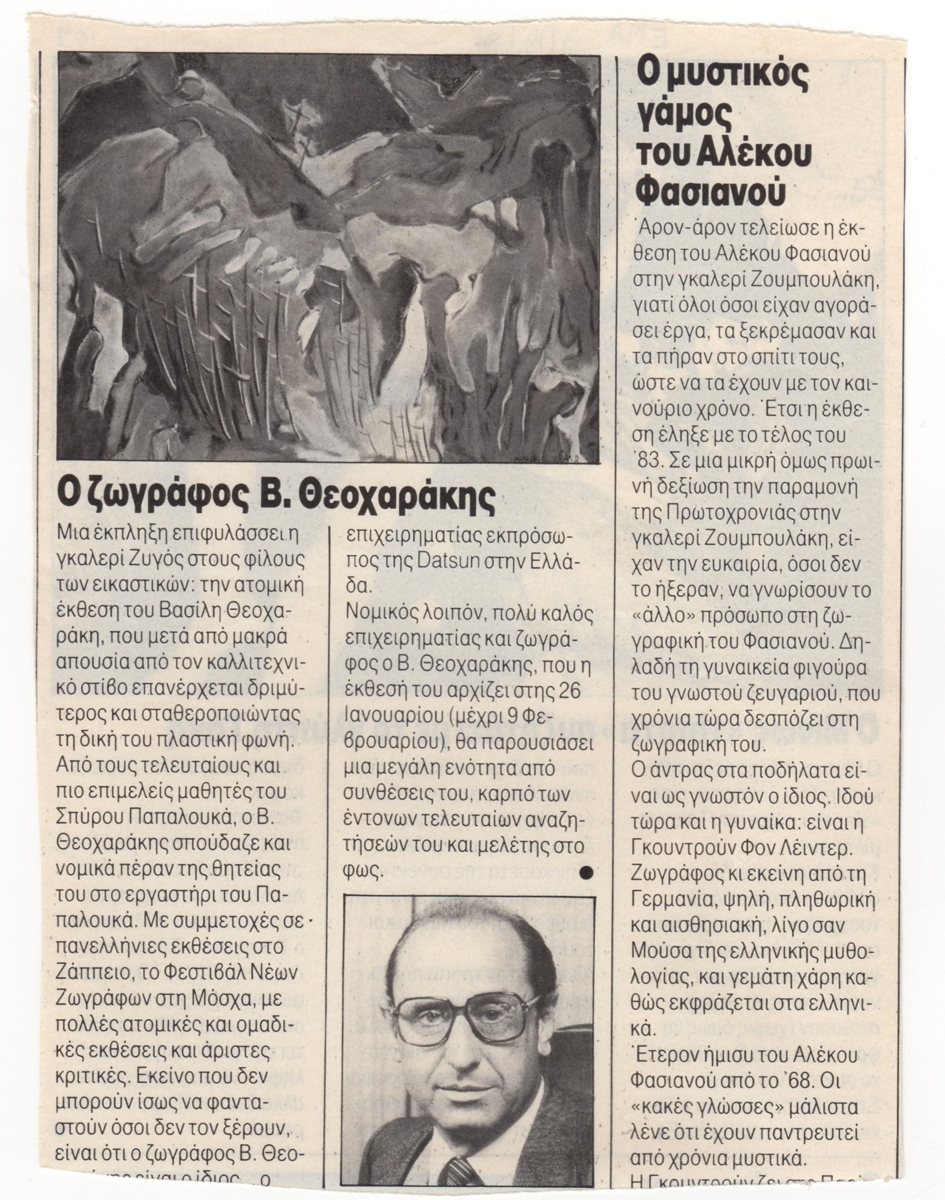 Απόκομμα, χαρτί ιλουστρασιόν, 16,3×12,2 εκ., όπου δημοσιεύεται, στα ελληνικά, απόσπασμα άρθρου για την ατομική έκθεση του Βασίλη Θεοχαράκη στην Αθήνα το 1984. Στο ίδιο απόκομμα απόσπασμα άρθρου με τίτλο “Ο μυστικός γάμος του Αλέκου Φασιανού” όπου αναφέρεται έκθεση του καλλιτέχνη στην γκαλερί Ζουμπουλάκη το 1983. Στην άλλη όψη δημοσίευμα για τον Μ. Αργυράκη και τον γλύπτη Τάκη.