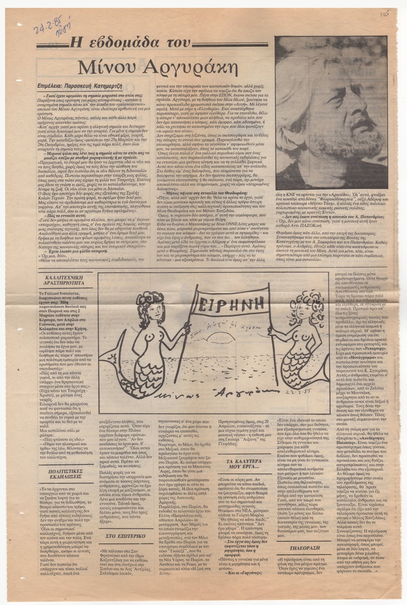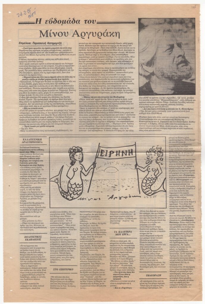 Απόκομμα της εφημερίδας “Η Αυγή” (24/02/1985) όπου δημοσιεύεται συνέντευξη του Μίνωα Αργυράκη στη δημοσιογράφο Παρασκευή Κατημερτζή. Ο καλλιτέχνης αναφέρεται σε συναυλία του Μίκη Θεοδωράκη και σε εκθέσεις του στο Γαλλικό Ινστιτούτο, στον Πειραιά, στην Κέρκυρα, τα Γιάννενα, την Καλαμάτα και την Κρήτη.