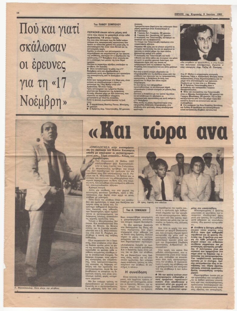 Αποκόμματα, έντυπα, χαρτί, 39,0×9,5 και 39,0×29,0 εκ., όπου δημοσιεύεται, στα ελληνικά, άρθρο του Πάνου Σόμπολου για την τρομοκρατική οργάνωση “17 Νοέμβρη”. Εικονογραφείται με φωτογραφία του Θ. Τσούρα, υπουργού δημοσίας τάξης. Στην ίδια σελίδα, απόσπασμα άρθρου του Α. Ξενικάκη από την δικαστική επικαιρότητα. Στην πίσω όψη, άρθρο του Μ. Αργυράκη “Πως γλιτώσαμε από τις συμπληγάδες των τριών Κωνσταντίνων”