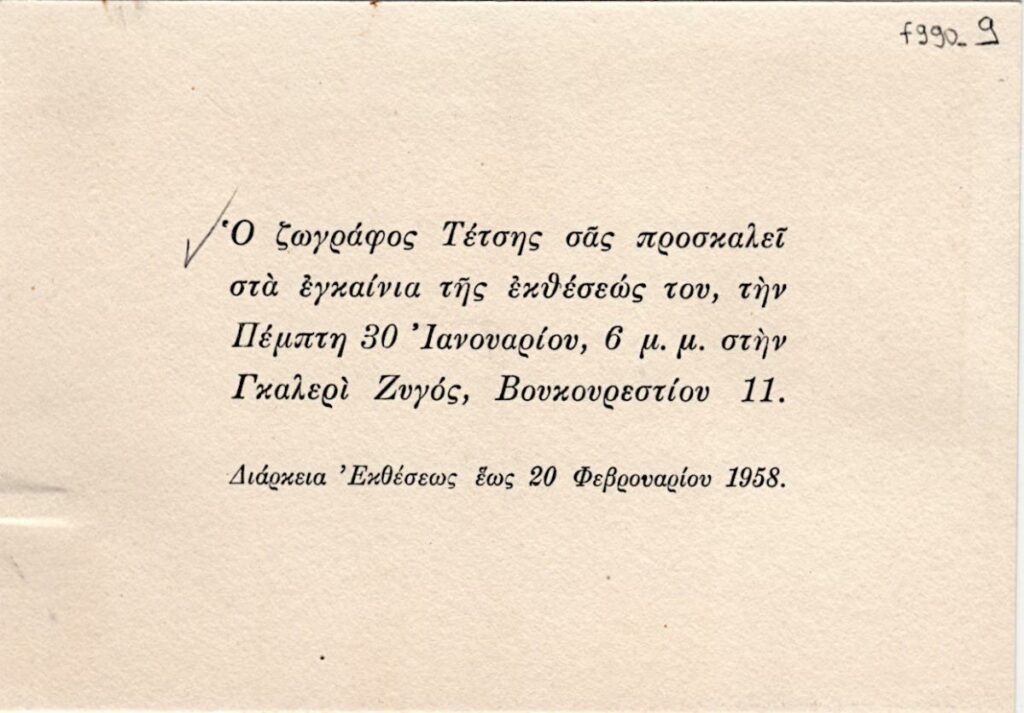 Πρόσκληση εγκαινίων της ατομικής έκθεσης ζωγραφικής του Παναγιώτη Τέτση στην Γκαλερί “Ζυγός” στην Αθήνα.