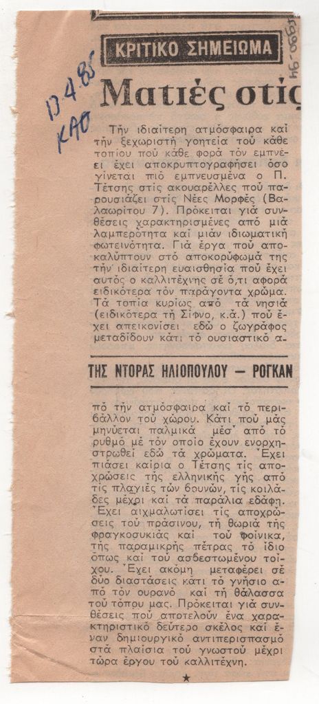 Απόκομμα, έντυπο, χαρτί, 16,0×7,0 εκ., όπου δημοσιεύεται, στα ελληνικά, κριτική της Ντόρας Ηλιοπούλου-Ρογκάν για την ατομική έκθεση με ακουαρέλλες του Παναγιώτη Τέτση στην Αθήνα το 1985. Αριστερά, επιγραφή με τα στοιχεία της δημοσίευσης.