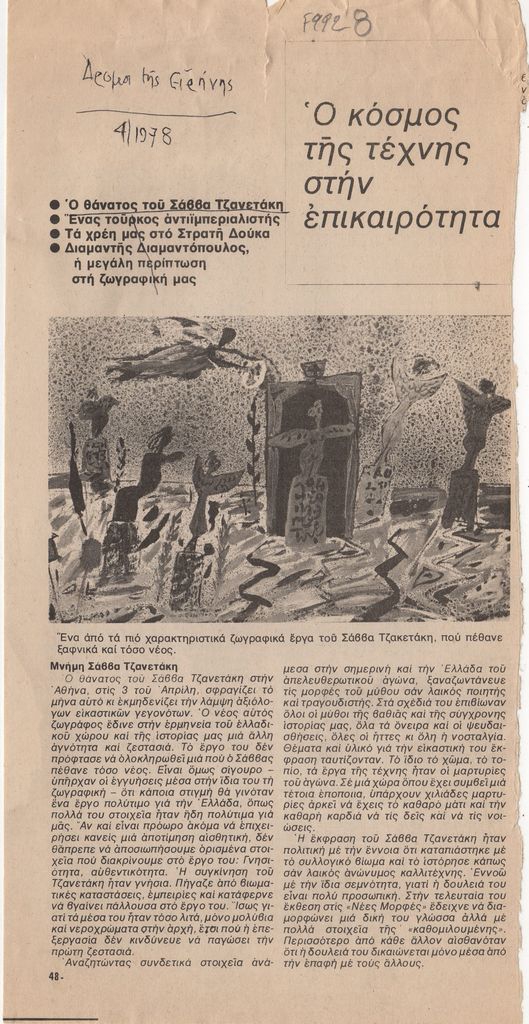 Απόκομμα, χαρτί, 27.5×13.5 εκ., στα ελληνικά, δημοσίευσης άρθρου αναφερόμενου στο θάνατο του Σάββα Τζανετάκη.