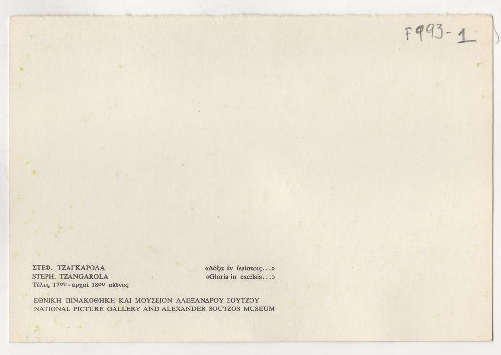 Κάρτα, χαρτόνι διπλής όψης, 11×16.5 εκ., με αναπαραγωγή έργου, έγχρωμη, του Στέφανου Τζανκαρόλα.