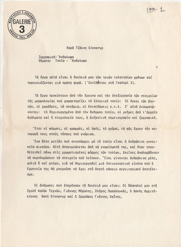 Έντυπο, χαρτί, 30×21 εκ., στα ελληνικά, έκθεσης της Χαράς Τζάνη στην Αθήνα.