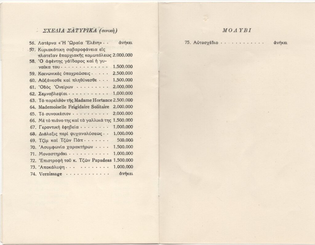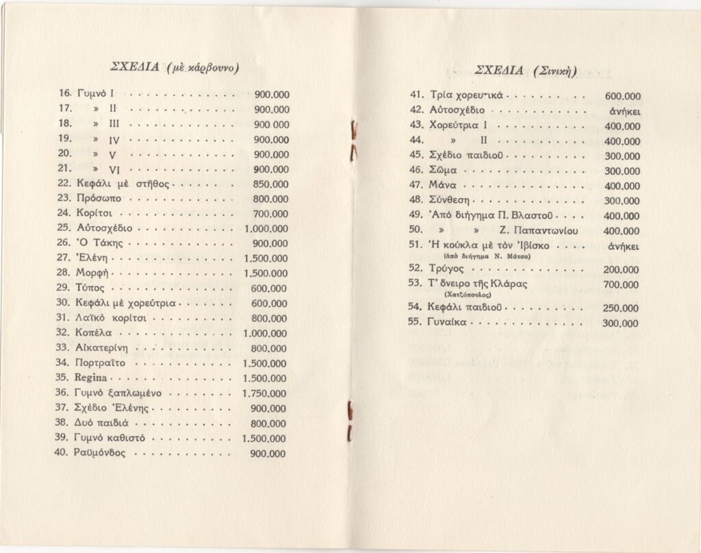 Έντυπο, χαρτί, 4 φφ, 19,2×12,5 εκ., στα ελληνικά. Τιμοκατάλογος έργων της ατομικής έκθεσης του Μίνωα Αργυράκη στην Αθήνα το 1954. Από το εξώφυλλο λείπει απόκομμα.