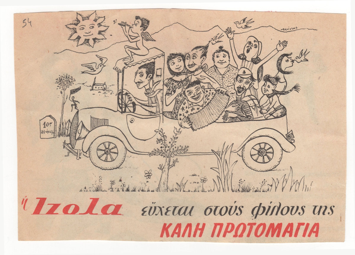 Απόκομμα, έντυπο, στα ελληνικά, χαρτί, 12,0×17,1 εκ., όπου δημοσιεύεται, αναπαραγωγή σχεδίου που έγινε για διαφημιστικό μήνυμα της εταιρείας Izola με ευχές για την Πρωτομαγιά.
