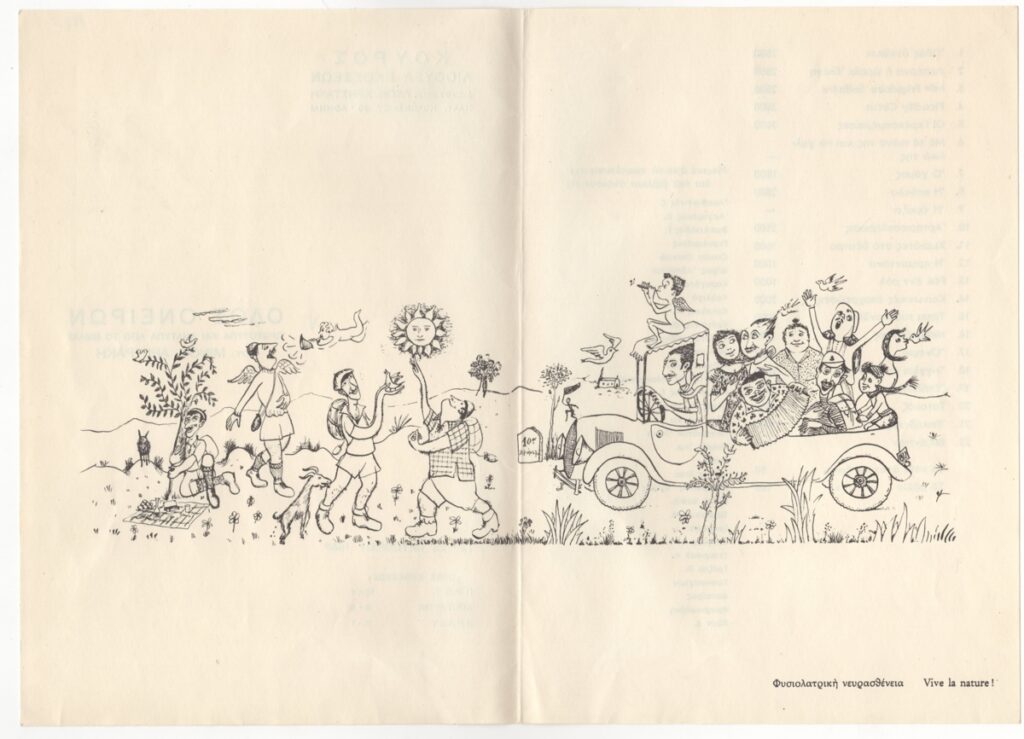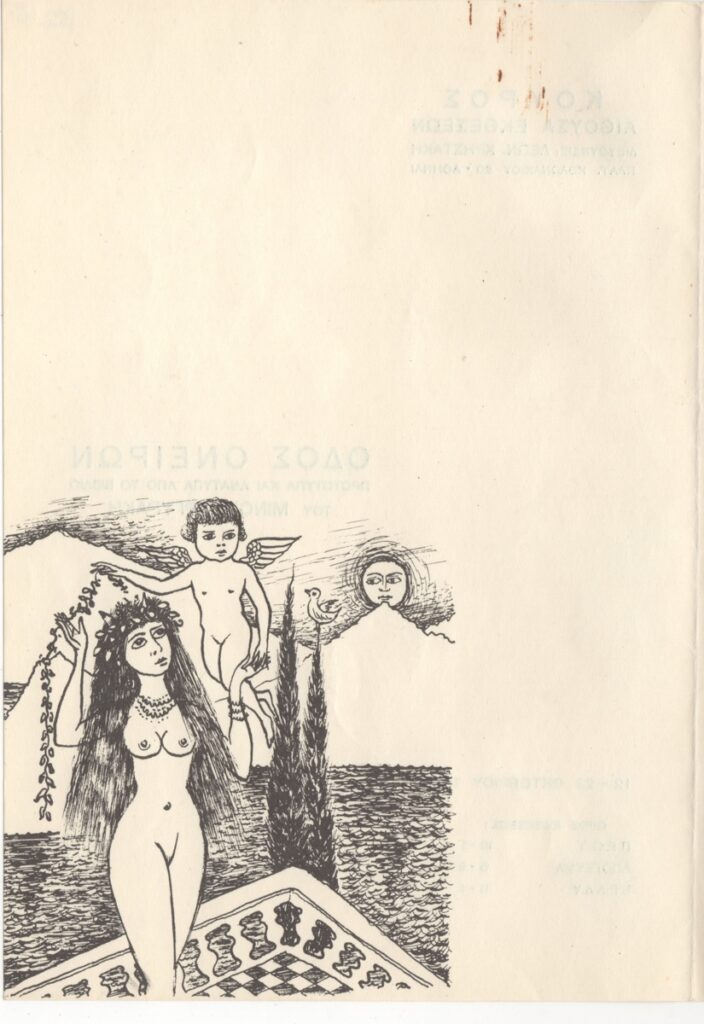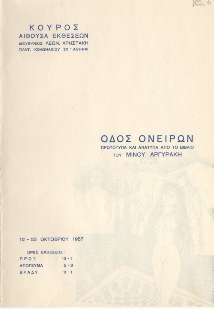 Έντυπο, 2 δίτπυχα και 1 απόκομμα, χαρτί, 24,0×16,6 εκ. Φυλλάδιο της ατομικής έκθεσης έργων του Μίνωα Αργυράκη με πρωτότυπα και ανάτυπα από το βιβλίο του “Οδός Ονείρων”. Περιλαμβάνει αναπαραγωγή σχεδίων του καλλιτέχνη και τιμοκατάλογο έργων.