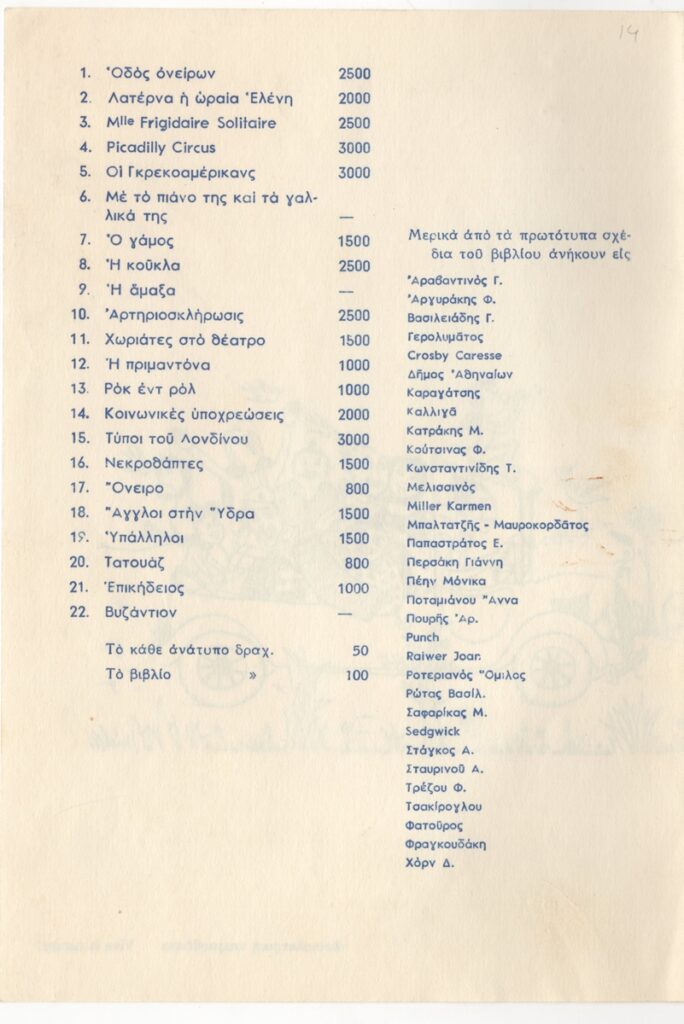 Δημήτρης Α. Χαρισιάδης (1911 - 1993) ; Νικόλαος Χατζηκυριάκος-Γκίκας (1906 - 1994) ; Γιάννης Μόραλης (1916 - 2009) ; Παύλος Ζάννας (1929 - 1989) ; Γιάννης Παππάς (1913 - 2005) ; Άγγελος Δεληβορριάς (1937 - 2019) ; Nelly's (1899 - 1998) ; Franz Fiedler (1885 - 1956) ; Άγγελος Σεραϊδάρης