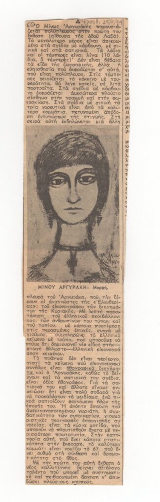 Απόκομμα της εφημερίδας “Ελευθερία” (15/04/1954), όπου δημοσιεύεται κριτική για την πρώτη έκθεση έργων του Μίνωα Αργυράκη στην Αθήνα.