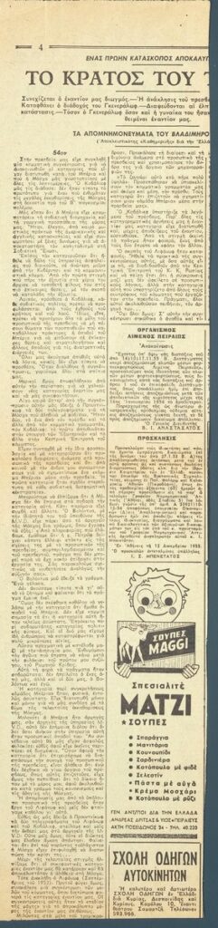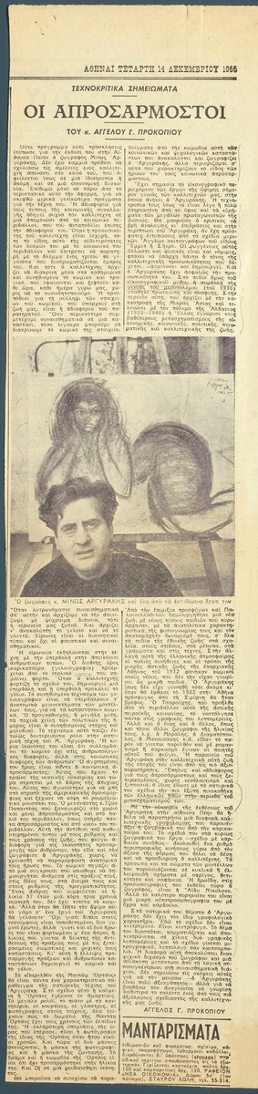 Απόκομμα εφημερίδας (14/12/1955), όπου δημοσιεύεται κριτική για την ατομική έκθεση έκθεση του Μίνωα Αργυράκη στην Αθήνα.