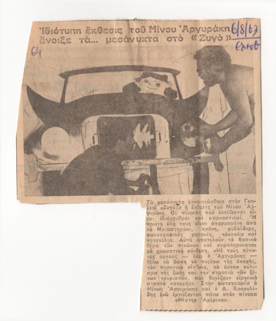 Απόκομμα, έντυπο, χαρτί, 7,5-12,0×4,8-10,0 εκ. (ακανόνιστο σχήμα), όπου δημοσιεύεται, στα ελληνικά, άρθρο του Δημήτρη Κακουλίδη για τα εγκαίνια της ατομικής έκθεσης έργων του Μίνωα Αργυράκη στην Αθήνα το 1963. Επάνω, επιγραφή, με τα στοιχεία της δημοσίευσης.
