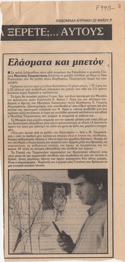 Απόκομμα, χαρτί, 27×13 εκ., στα ελληνικά, δημοσίευσης άρθρου αναφερόμενου σε έργο του Μανόλη Τζομπανάκη, με θέμα τον Νίκο Καζαντζάκη, που θα στηθεί στο χωριό του λογοτέχνη.