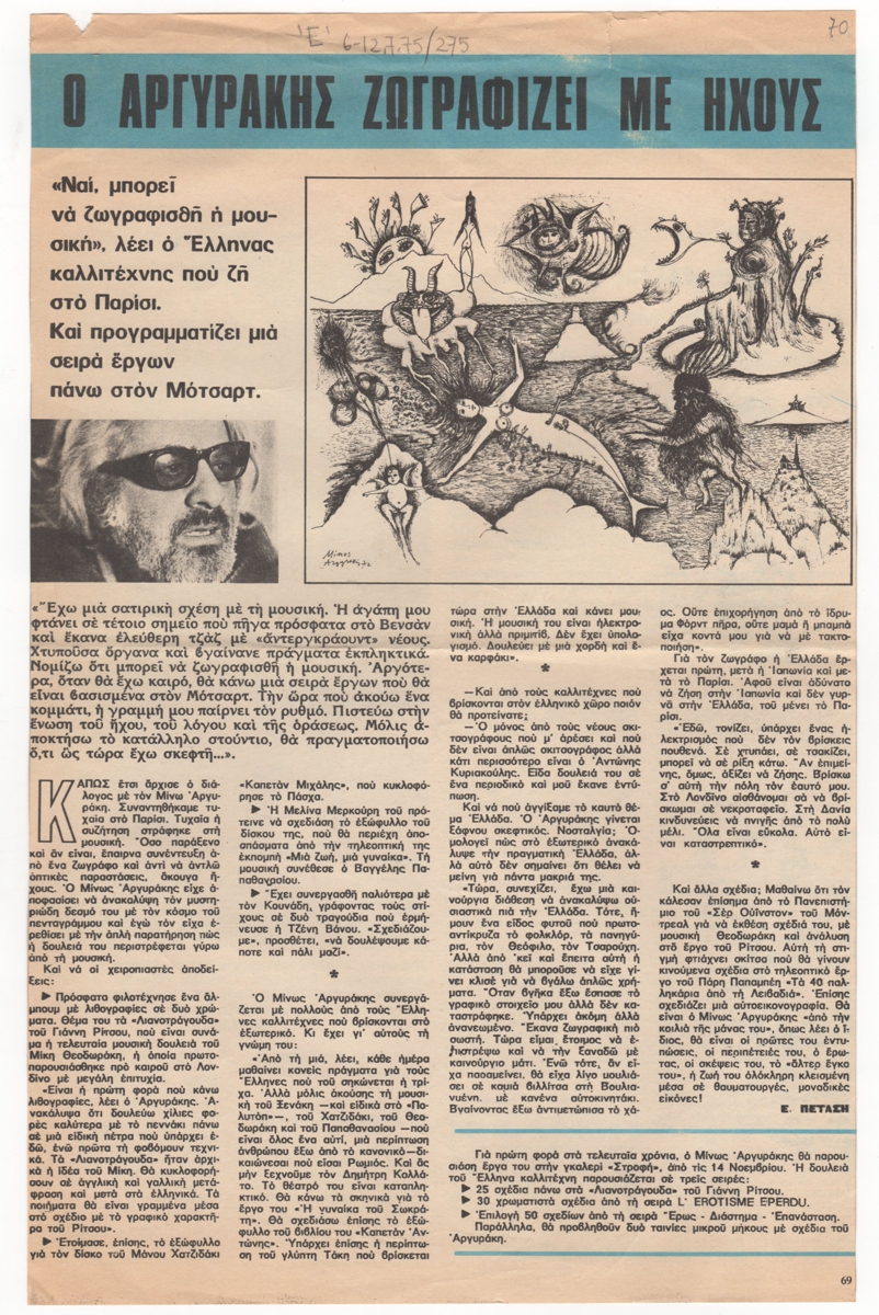 Απόκομμα, έντυπο, χαρτί, 33,5×21,5 εκ., όπου δημοσιεύεται, στα ελληνικά, συνέντευξη του καλλιτέχνη, όπου αναφέρεται στην πρόθεσή του να ζωγραφίσει σειρά έργων βασισμένα στον Mozart, καθώς και έργα όπως η δημιουργία άλμπουμ με λιθογραφίες με θέμα τα “Λιανοτράγουδα” του Γ. Ρίτσου, το εξώφυλλο δίσκου του Μ. Χατζιδάκι, το εξώφυλλο δίσκου της Μ. Μερκούρη, τη συγγραφή στίχων του Αργύρη Κουνάδη κ.ά. Αναφέρεται επίσης η διοργάνωση έκθεσης στην γκαλερί “Στροφή”. Επάνω, επιγραφή. Στην πίσω σελίδα απόσπασμα συνέντευξης του σκηνοθέτη Γιώργου Τζαβέλλα.
