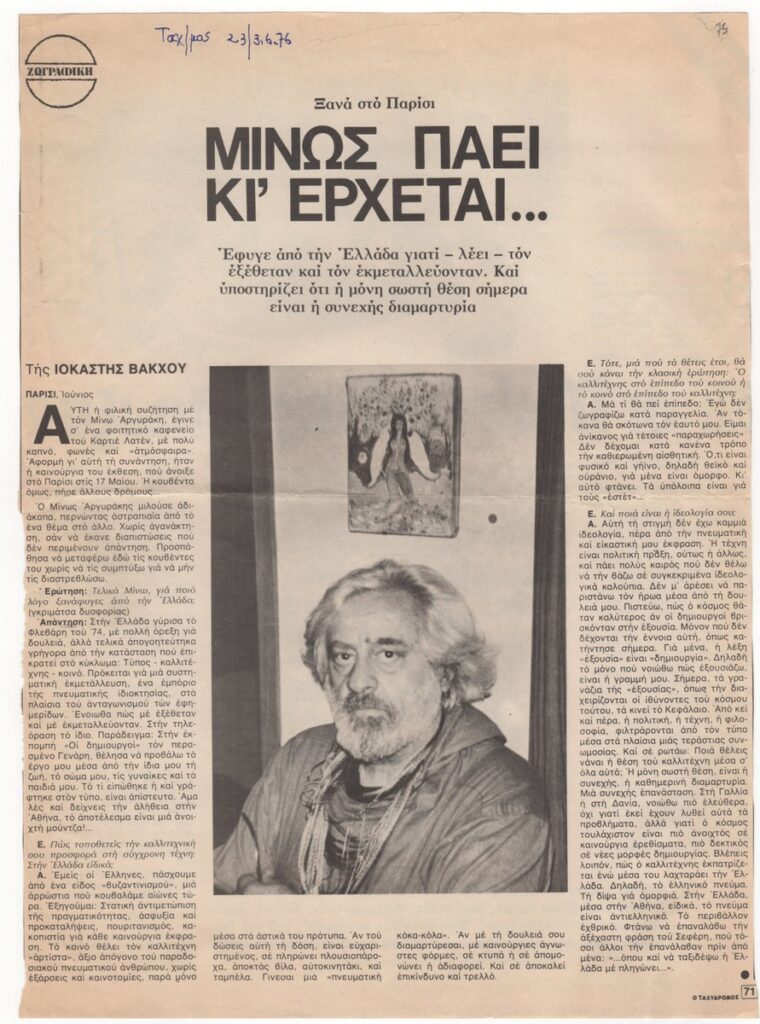 Απόκομμα του περιοδικού “Ο Ταχυδρόμος” (03/06/1976) όπου δημοσιεύεται συνέντευξη με τον καλλιτέχνη σχετικά με την αποχώρησή του από την Ελλάδα το 1976.