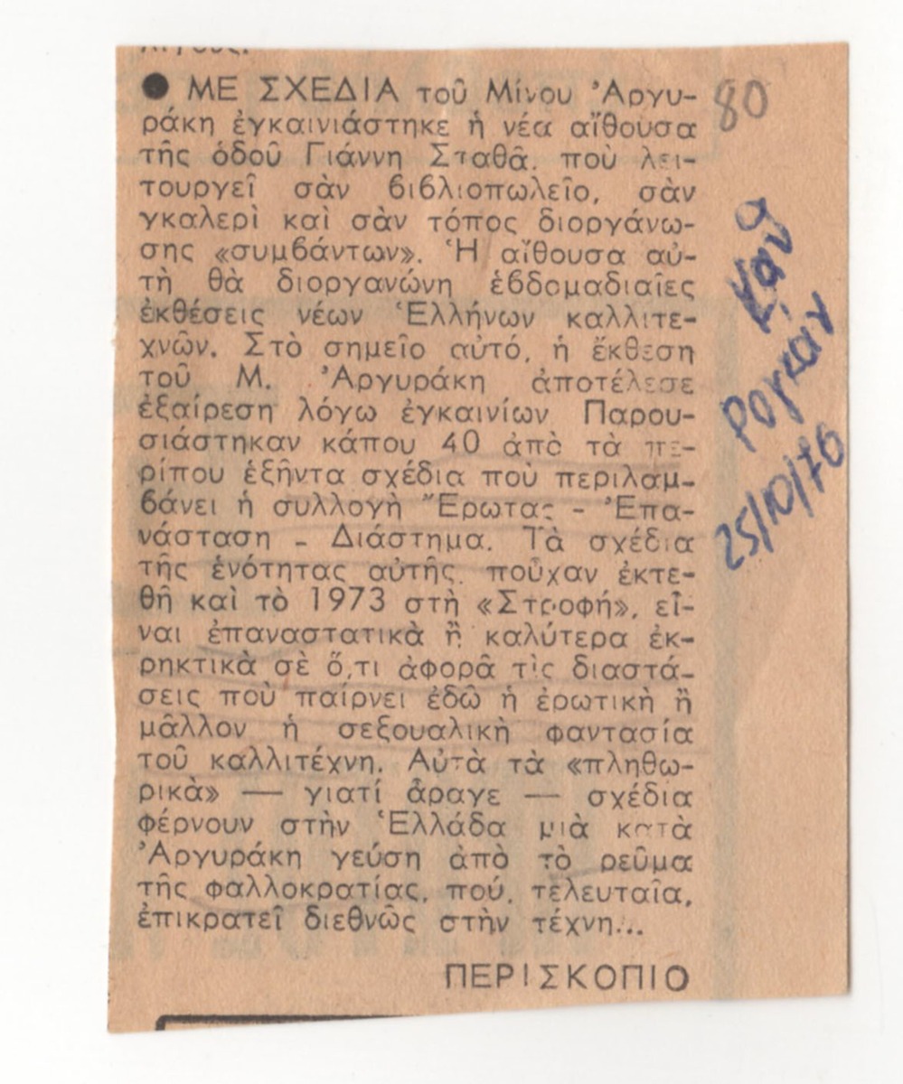Απόκομμα της εφημερίδας “Η Καθημερινή” (25/10/1976), όπου δημοσιεύεται άρθρο για την ατομική έκθεση του Μίνωα Αργυράκη στην Αθήνα, όπου παρουσιάστηκαν έργα της ενότητας “Έρωτας – Επανάσταση – Διάστημα”.