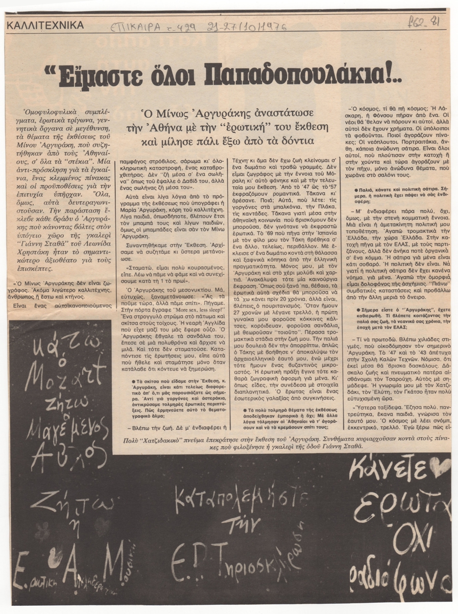 Απόκομμα, έντυπο, χαρτί, 2 τμήματα, 27,2×20,3 εκ. και 27,5×10 εκ., όπου δημοσιεύεται, στα ελληνικά, συνέντευξη του Μίνωα Αργυράκη με αφορμή την ατομική έκθεσή του στην Αθήνα το 1976. Στο πρώτο απόκομμα, επιγραφή με τα στοιχεία της δημοσίευσης. Στην πίσω πλευρά του πρώτου αποκόμματος πολιτιστική ατζέντα.