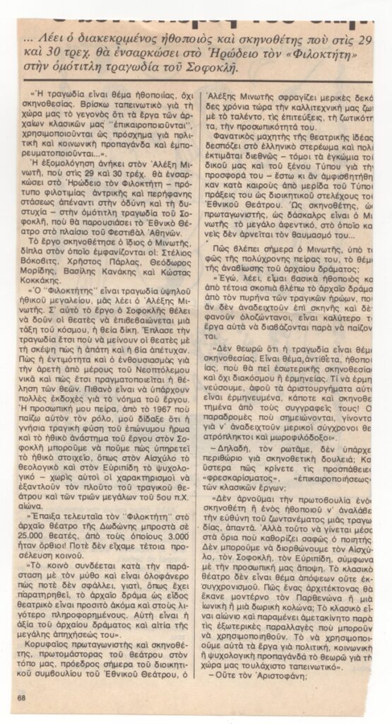 Απόκομμα εντύπου, χαρτί, 24,0×12,3 εκ., όπου δημοσιεύεται, στα ελληνικά, απόσπασμα συνέντευξης του Αλέξη Μινωτή με την ευκαιρία της παράστασης της τραγωδίας του Σοφοκλή “Φιλοκτήτης” σε σκηνοθεσία του ίδιου. Στην άλλη πλευρά δημοσίευμα σχετικά με τον Μίνωα Αργυράκη και τον Μάνο Χατζιδάκι.