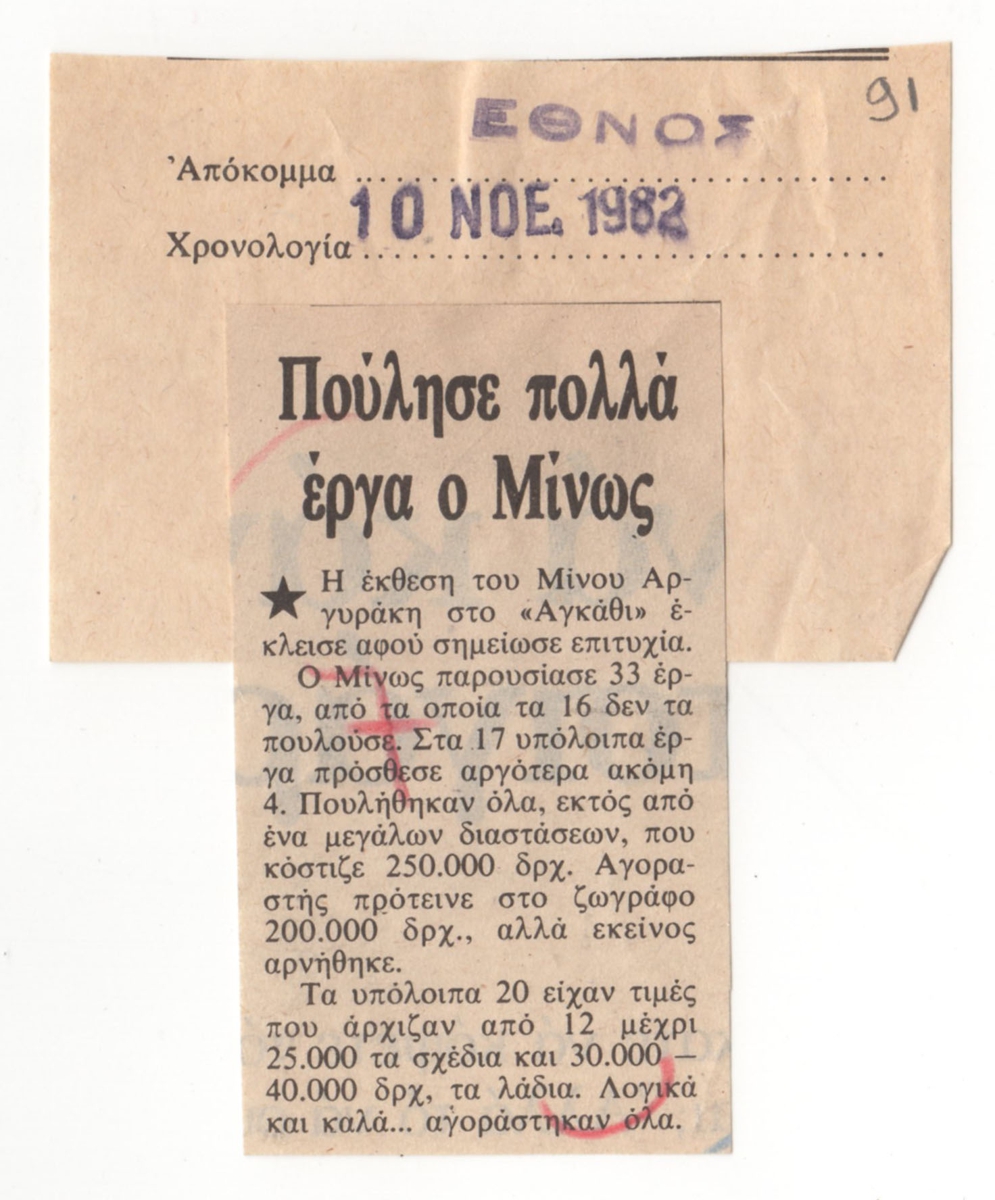 Απόκομμα, έντυπο, χαρτί, 8,0×4,6 εκ., όπου δημοσιεύεται, στα ελληνικά, άρθρο για την ατομική έκθεση έργων του Μίνωα Αργυράκη στην Αθήνα το 1982. Επάνω, επικολλημένο έντυπο απόκομμα χαρτιού, 6,0×8,5 εκ, με τα στοιχεία της έκδοσης (σφραγίδες).