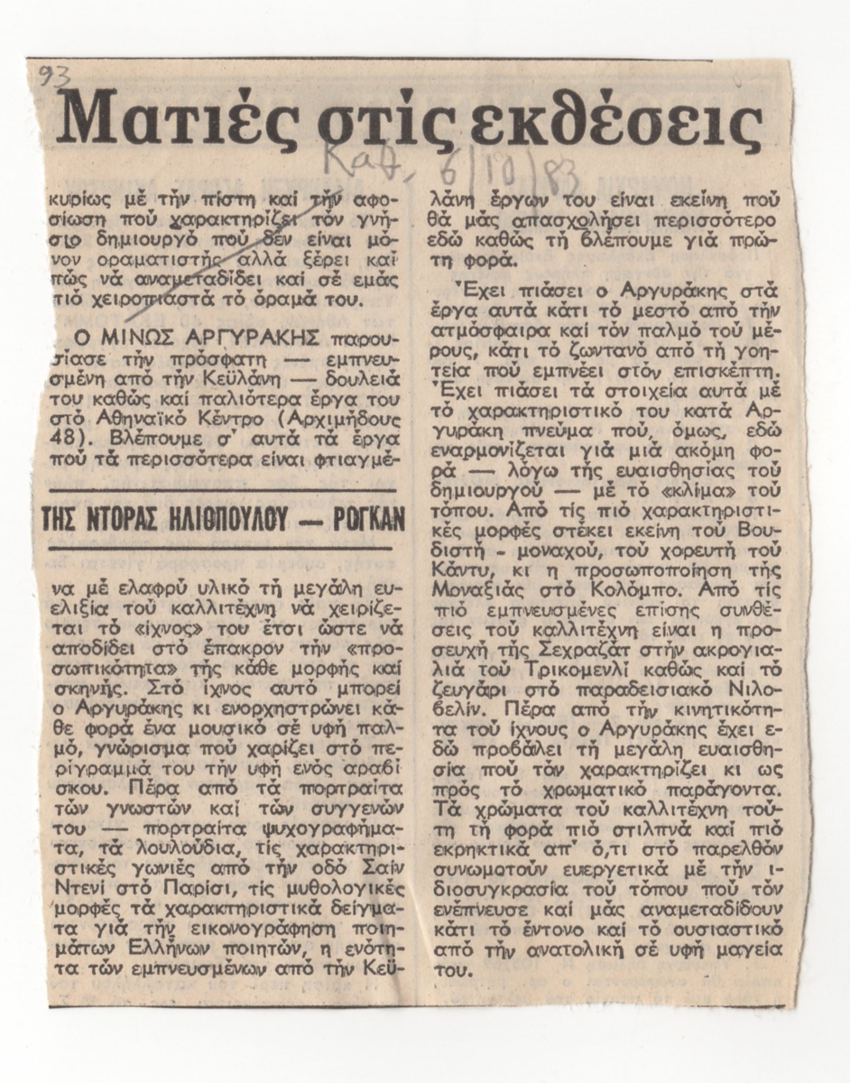 Απόκομμα, έντυπο, χαρτί, 12,6×10,5 εκ., όπου δημοσιεύεται, στα ελληνικά, άρθρο της Ντόρας Ηλιοπούλου-Ρογκάν για την ατομική έκθεση έργων του Μίνωα Αργυράκη με έργα εμπνευσμένα από την Κεϊλάνη καθώς και παλιότερα έργα του στην Αθήνα το 1983. Κάτω από τον τίτλο, επιγραφή.