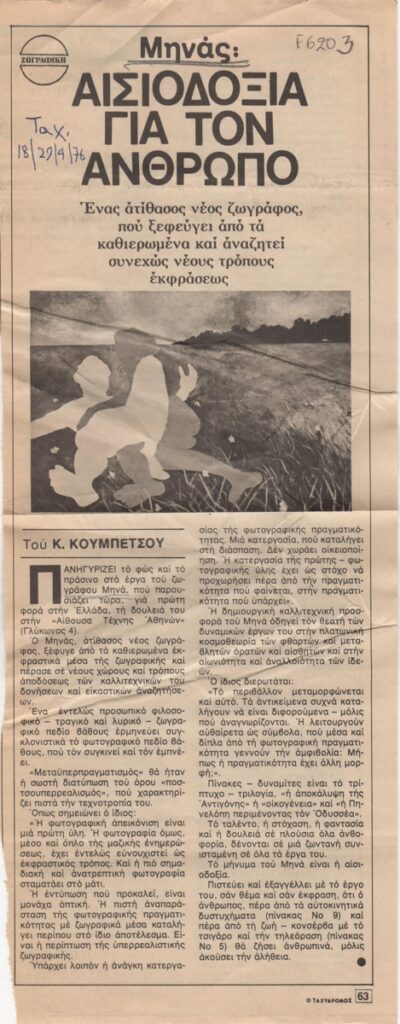 Απόκομμα, χαρτί, 32×12,5 εκ., στα ελληνικά, δημοσίευσης κριτικής έκθεσης του Μηνά (Σεμερτζιάν), η οποία διεξάγεται στην Αίθουσα Τέχνης Αθηνών. Εντάσσεται στη στήλη “Ζωγραφική” του εντύπου.