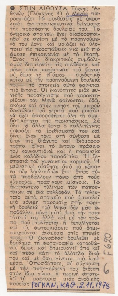 Απόκομμα, χαρτί, 15×5,5 εκ., στα ελληνικά, δημοσίευσης κριτικής έκθεσης του Μηνά (Σεμερτζιάν), η οποία διεξάγεται στην Αίθουσα Τέχνης Αθηνών, το 1978. Το απόκομμα φέρει επιγραφές.
