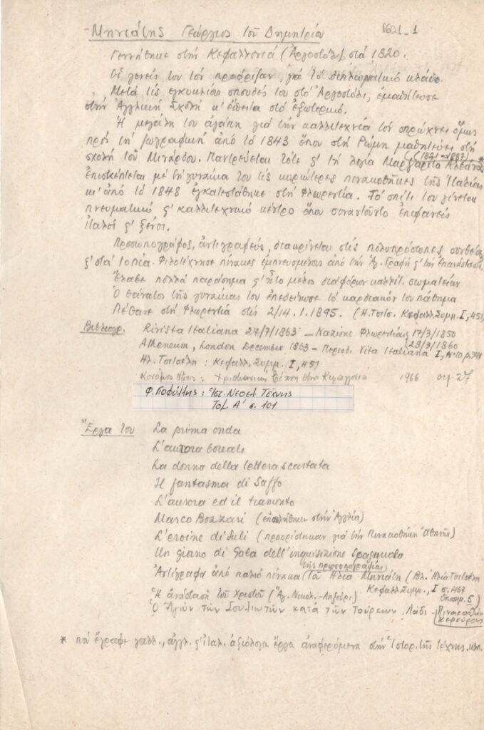 Κείμενο, χειρόγραφο, με μολύβι, στα ελληνικά, χαρτί, 30,0×20,0 εκ. Βιογραφικά στοιχεία για τον ζωγράφο Γεώργιο Μηνιάτη με ιδιαίτερη αναφορά στις σπουδές του, το έργο του, βιβλιογραφία και εργογραφία.