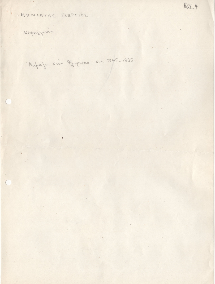 Κείμενο, χειρόγραφο, με μολύβι, στα ελληνικά, χαρτί, 28,5×21,2 εκ. Σημείωση για τον ζωγράφο και αγιογράφου Γεώργιο Μηνιάτη.