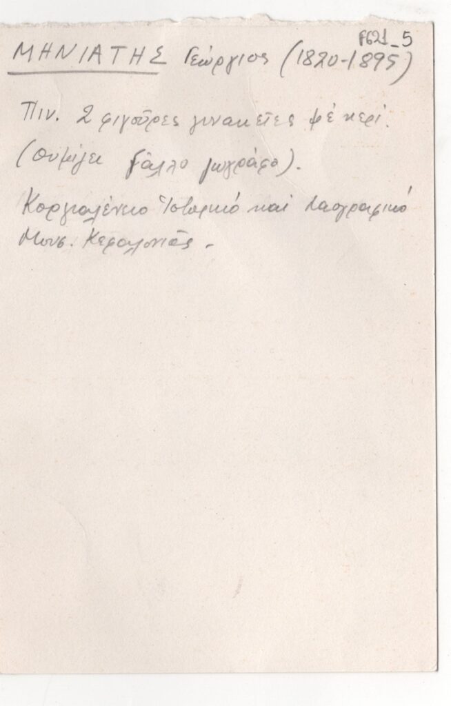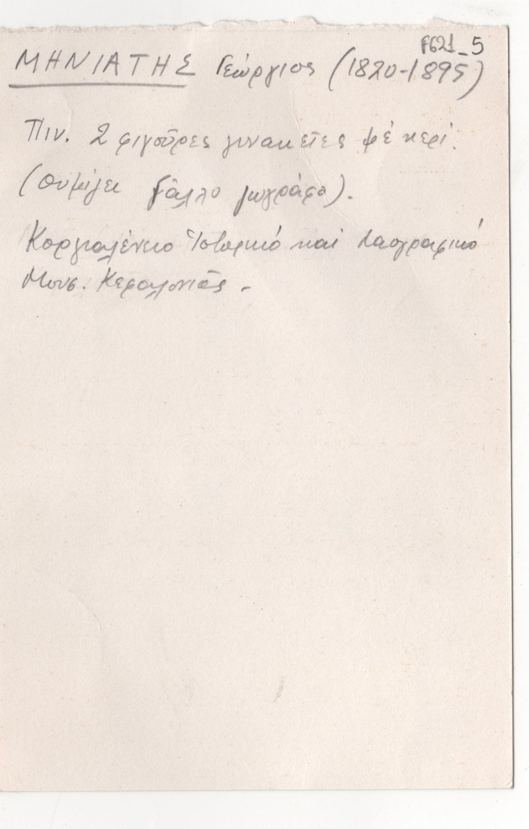 Κείμενο, χειρόγραφο, στα ελληνικά, στην πίσω όψη αποκόμματος εντύπου έκθεσης, στα γαλλικά, χαρτόνι, 15,7×10,5 εκ. Σημείωση σχετικά με πίνακα του Γεώργιου Μηνιάτη που ανήκε στο Κοργιαλένειο Ιστορικό και Λαογραφικό Μουσείο Κεφαλονιάς.