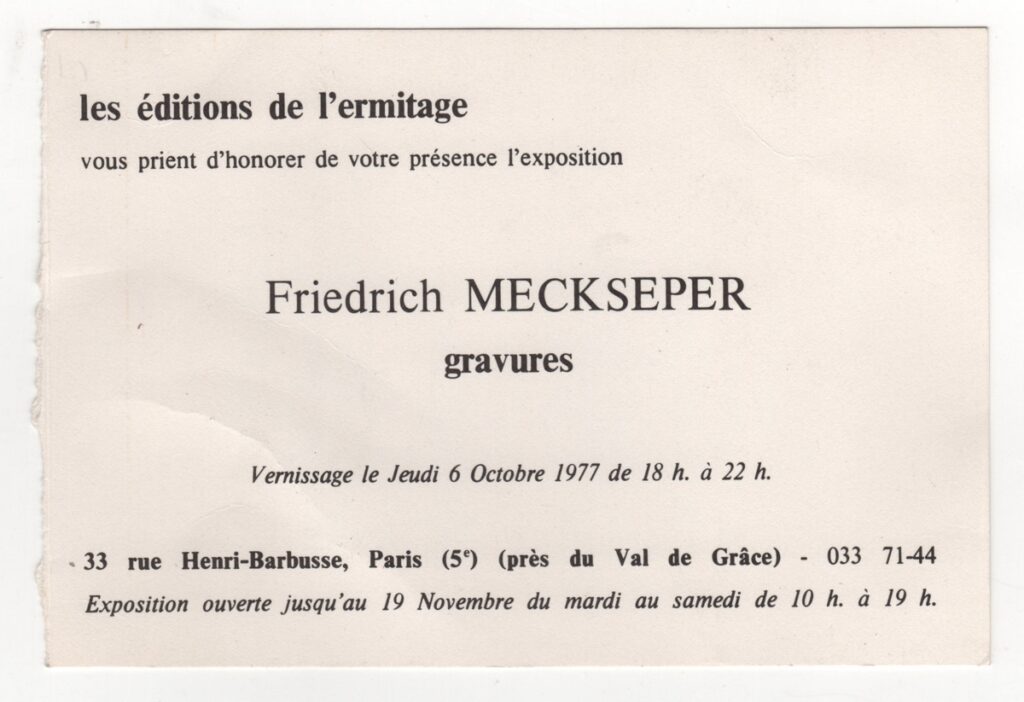 Απόκομμα εντύπου έκθεσης, στα γαλλικά, χαρτόνι, 10,5×15,6 εκ. Πρόσκληση εγκαινίων της ατομικής έκθεσης χαρακτικής του Friedrich Meckseper στο Παρίσι.