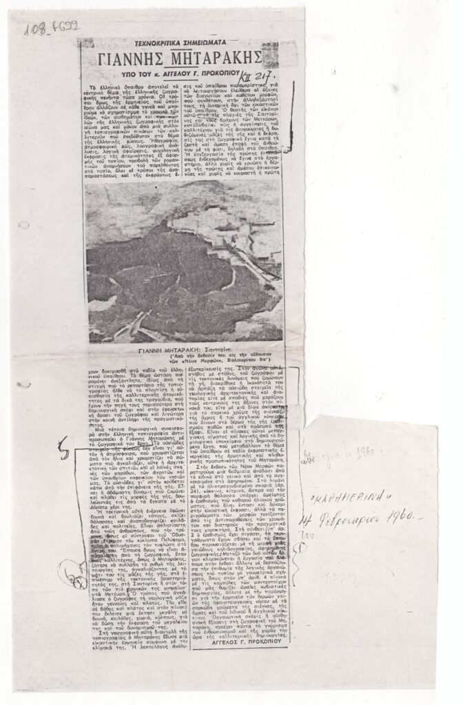 Φωτοαντίγραφο αποκόμματος εφημερίδας, στα ελληνικά, χαρτί, 24,7×18,6 εκ. Κριτική του Άγγελου Προκοπίου για την ατομική έκθεση ζωγραφικής του Γιάννη Μηταράκη στην Αθήνα το 1960. Εικονογραφείται με αναπαραγωγή έργου. Κάτω δεξιά επιγραφή με τα στοιχεία της δημοσίευσης.