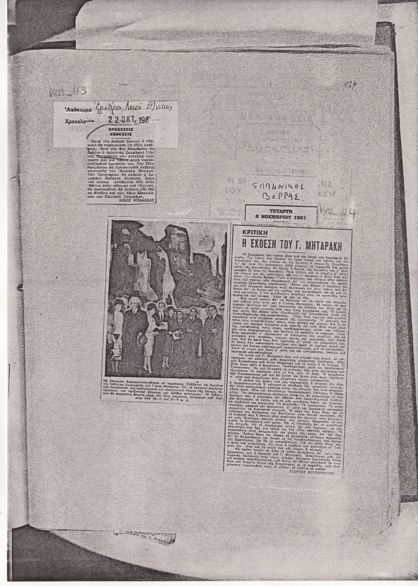 Φωτοαντίγραφο αποκόμματος εφημερίδας, στα ελληνικά, χαρτί, 29,8×21,0 εκ. Κριτική του Γιώργου Κιτσόπουλου για την ατομική έκθεση ζωγραφικής του Γιάννη Μηταράκη στη Θεσσαλονίκη το 1961. Εικονογραφείται με φωτογραφία από τα εγκαίνια της έκθεσης. Επάνω, επιγραφή με την πηγή της δημοσίευσης.