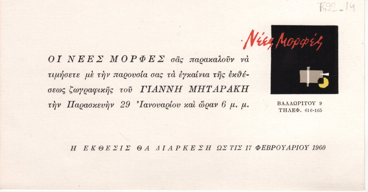 Έντυπο έκθεσης, στα ελληνικά, μονόφυλλο, ιλουστρασιόν χαρτόνι, 8,7×16,5 εκ. Πρόσκληση εγκαινίων της ατομικής έκθεσης ζωγραφικής του Γιάννη Μηταράκη στην Αθήνα το 1960.
